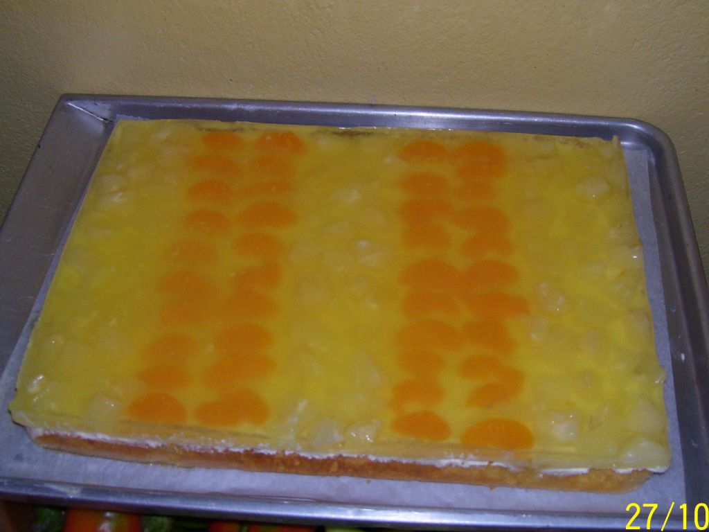 Z vychladlého piškotu stáhneme škraloup a papír na pečení a rozetřeme po celé ploše připravený krém. Broskve ocedíme, nakrájíme na tenké plátky a rozložíme na připravený piškot s krémem. Zalijeme vychladlou želatinou a necháme v chladnu ztuhnout. Po ztuhnutí nakrájíme.