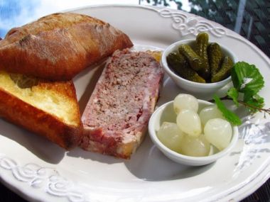 Pomocí ostrého nože posekat najemno vepřové maso, pupek, kuřecí játra, a slaninu. Vložit vše do mísy, osolit, opepřit, a přidat oříšek, jalovčinky a brandy. V chladnu nechat odpočinout do druhého dne. Předehřát troubu na 180°C. Lehce vymastit Terrine, nebo chlebíčkovou formu. Do masové směsi přimíchat šalotky a vejce. Dobře promíchat. Na spodek nádoby okrasně poskládat bobkové listy a potom vyložit nádobu pomocí plátků slaniny tak, aby nahoře přesahovaly přes okraj nádoby. Do připravené Terine, nebo chlebíčkové formy lžicí přendat vsechnu masovou směs. Směs uhladit obrácenou stranou lžíce a přeložit přes ni plátky slaniny, které jsme nechaly přesahovat přes nádobu. Povch všeho přikrýt dobře máslem potřeným pečícím papírem a potom celou nádobu zabalit do alobalu. Položit nádobu do jiné větší nádoby, nebo plechu s vysokým okrajem, vložit vše do trouby a do větší nádoby nalít vařící vodu (takto se vytvoří tz. Bain-Marie). Vody musí být tolik, aby dosahovala tak do poloviny nádoby (Terrine) s masem. Vše se peče v troubě tak dlouho, (asi 1 1/2 hodiny) až se Pate-Paštika-masová směs smrskne ode stran nádoby. Po upečení se paštika vyjme opatrně z trouby a z vodní lázně. Potom se i s alobalem nechá zchladnout. Ze studené paštiky se slije šťáva, která tam vznikla a paštika se vloží do chladničky na dobu až 1 týdne. (Někdy z paštiky ještě unikne trochu šťávy, což je normální.) Před podáváním opatrně objet strany nádoby nožem a pak paštiku vyklopit na servírovací mísu, nebo na destičku, kde se paštika krájí na plátky.