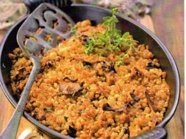 Sušené houby namočíme na 1-2 hodiny do studené vody, propláchneme je a podusíme. Kroupy uvaříme v dostatečném množství osolené vody doměkka. Na sádle osmahneme nakrájenou cibuli a přidáme zcezené houby a kroupy.Ochutíme utřeným česnekem,solí,kmínem a majoránkou. Dáme do tukem vytřeného pekáčku a ve vyhřáté troubě zapékáme do zlatova.