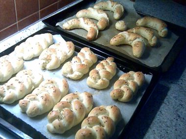 Uděláme si kvásek . Ostatní suroviny řádně promícháme a vypracujeme v hladké těsto , které necháme klidně 1 hodinu kynout. Rohlíky: Po té ho vyválíme na placku asi tak 2-3 mm silnou. Nakrájíme si ji na trojúhelníky a tvoříme z nich rohlíky , které potřeme vejcem a sypeme hrubou solí či kmínem. Housky: Rozdělíme si asi tak na 12 dílů a ty pak každý jeden rozdělíme na tři dílky z kterých si uděláme válečky a upleteme z nich housku. Tak pokračujeme až zděláme těsto. Dáme na plech s pečícím papírem a pečeme na 185°c do zlatova.
