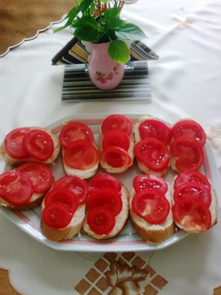 Chlebíčkovou veku nakrájíme (dělám 10 ks), namažeme jakýmkoliv rostlinným nebo živočišným tukem. Rajčata nakrájíme na kolečka, poklademe na pomazanou veku, posolíme, přidáme nakrájenou cibuli a nakonec dozdobíme majonézou. Můžeme poklást petrželkou nebo pažitkou.