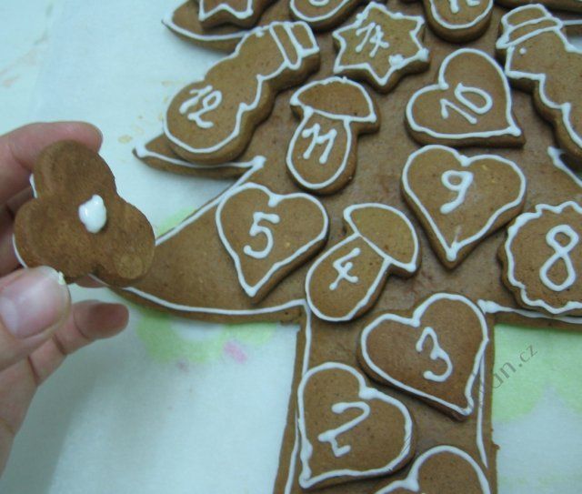 Do mísy dejte suché přísady. V medu rozmíchejte vejce a vlahé rozpuštěné máslo. Vzniklou hmotu vmíchejte k suché směsi a vypracujte těsto. Nechte ho uležet minimálně 2 hodiny v chladu. Pak rozválejte na asi 3-5mm silný plát a vykrojte si, podle připravené šablony, dva stromky cca velikosti plechu), ze zbylého těsta vykrajujte menší různé tvary. Potřete rozšlehaným vejcem a pečte na plechu s pečícím papírem na 180°C asi 7-10 minut (až těsto zpevní). Dvakrát prosátý cukr promíchejte s bílkem a citronovou šťávou, vzniklou polevou napište čísla a ozdobte kalendář (můžete vylepšit i barevnou polevou). Perníčky přilepíte ke stromku tak, že na zadní stranu perníčku dáte puntík polevy (raděj trochu větší) a perníček pak na strom přitisknete. Hotový kalendář ještě můžete dozdobit, zabalit do fólie a máte hezký dárek třeba k Mikuláši.